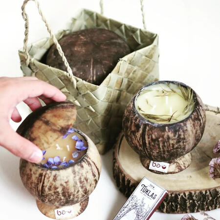 Each baO is unique as every coconut shell is unique, so no two candles are the same! Every candle has 150g of beeswax (regardless of shape and size), and is roughly 4x4x4". They come packed in a 5x5x5 bayong bag, made of pandan leaves. This is the best packaging I have found - sturdy & locally made!Location: baO is currently located in Barangay Maybunga, Pasig City, Metro Manila, Philippines.